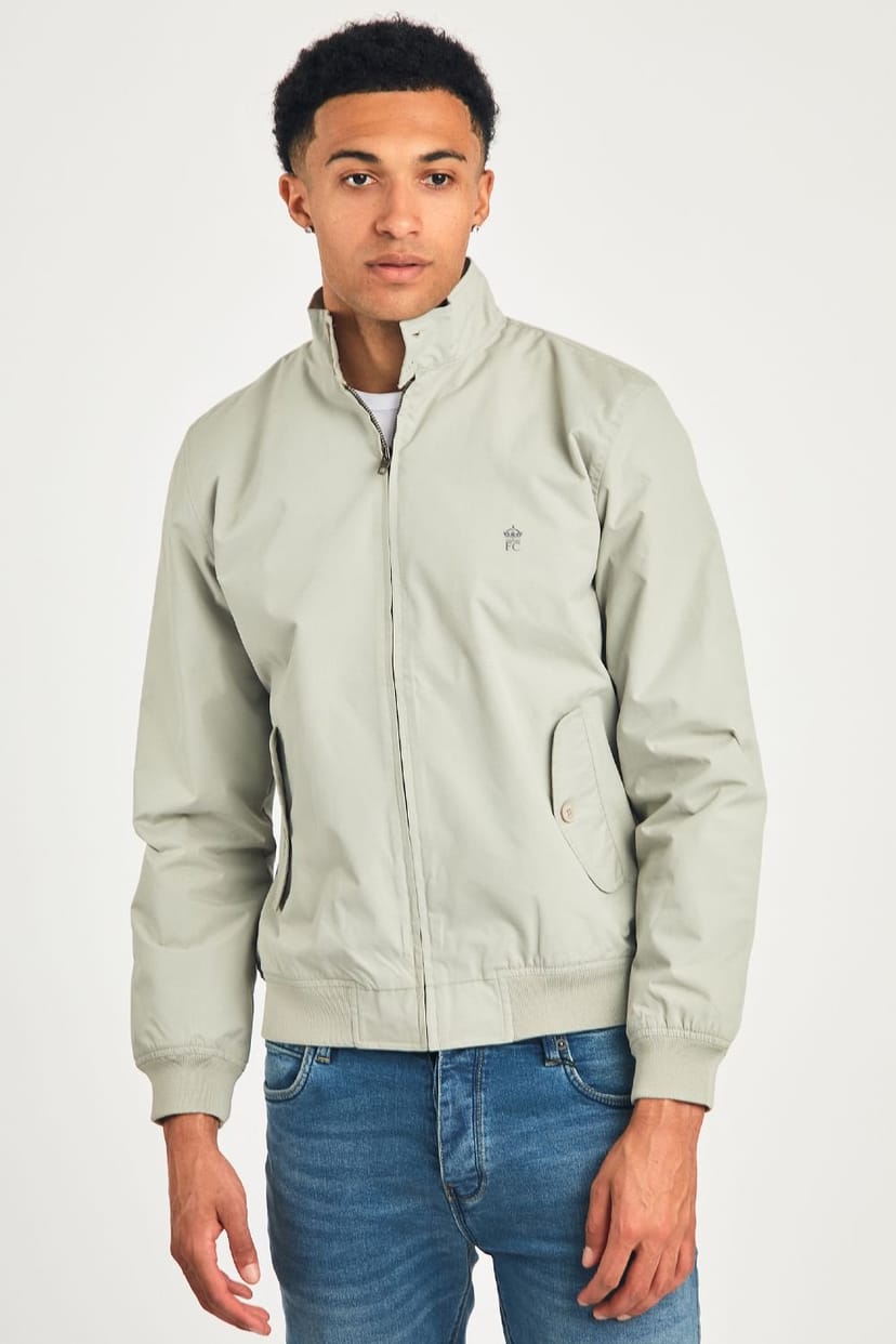 Lightweight Harrington jacket in stone featuring a funnel neck with double button collar, zip fastening, ribbed elasticated hem and cuffs, and two side button pockets. Includes a French Connection embroidered logo.