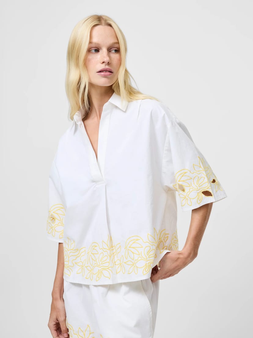 View French Connection UK's returns policyThis white cotton popover shirt by French Connection features a collar and v-neckline, floral embroidery, and cut-out detailing on the short sleeves. Pair it with the matching Alissa Cotton Shorts for a complete co-ord look.