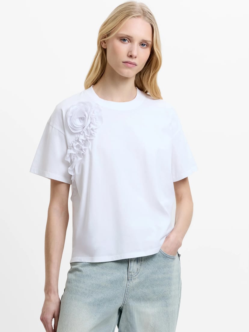 Elegant white cotton crepe t-shirt featuring a crew neckline and short sleeves. The floral ruffle detailing adds a modern feminine touch. Perfect for casual outings or layering under jackets.