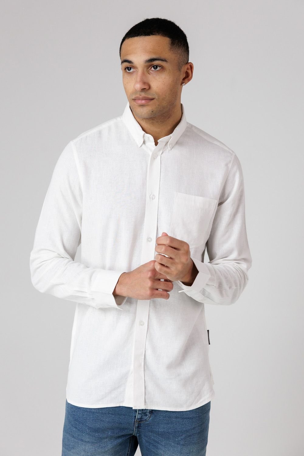 The French Connection Men's Linen Blend Long Sleeve Shirt in White is available in sizes 2XL, L, M, XL.