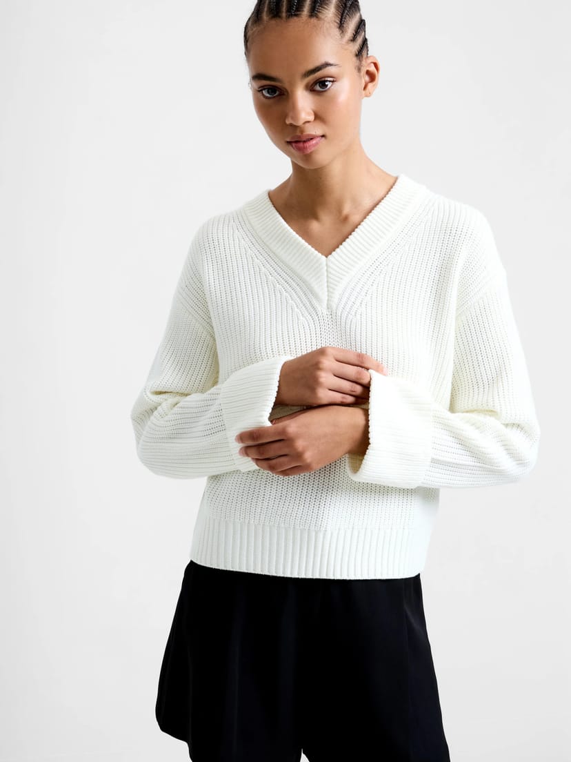 View French Connection UK's returns policyElegant Porcelain Cream V-Neck Jumper by French Connection. Crafted from a soft midweight knit, this piece features a ribbed v-neckline, drop shoulders, and long sleeves with ribbed turned-up cuffs. Ideal for casual and smart-casual looks.
