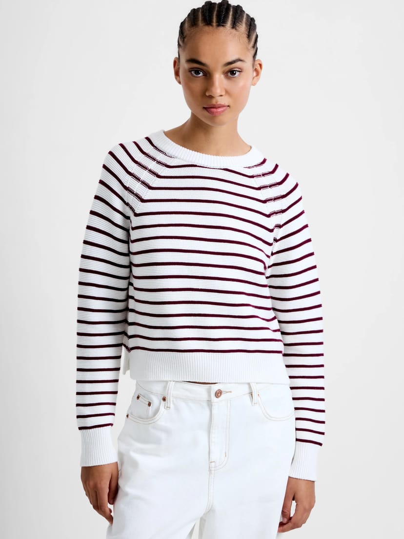 View French Connection UK's returns policyThis French Connection jumper features a crew neckline and long sleeves with ribbed cuffs. The textured knitted fabric showcases a contrasting stripe pattern in white and burgundy. Ideal for a casual yet stylish look.