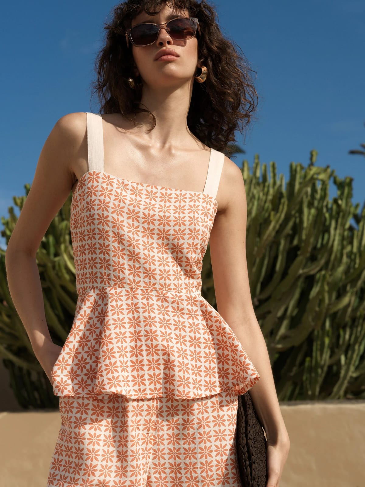 Playful floral print peplum top in cream and tangerine orange. Features a square neckline, wide contrast straps, and a softly flared peplum hem. Pair with matching shorts for a complete look.