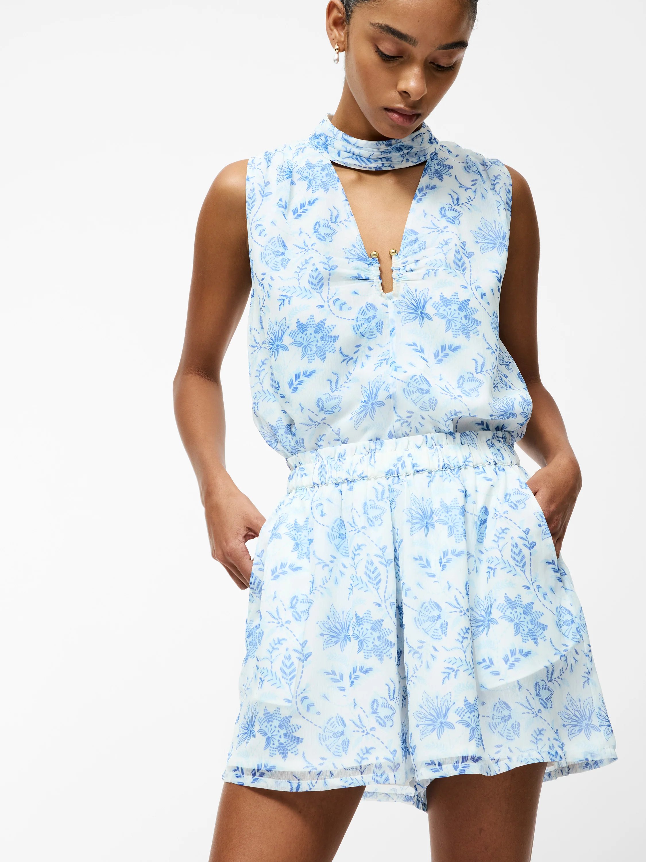 Slip into effortless chic summer styling with our Hallie Crinkle Shorts. Featuring a floaty silhouette with an easywear elasticated waistband, blue floral print, and roomy side pockets, this pair presents romantic, playful charm. Complete the co-ord with our matching V Neck Trim Top.