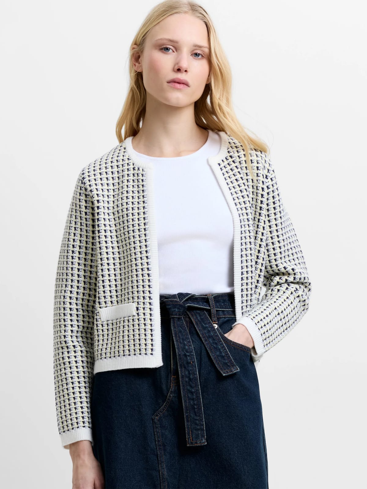 Chic and cosy, this textured knit cardigan from French Connection features an abstract pattern in mellow yellow and multi-colours. The cardigan has a round neckline, long sleeves with ribbed trim, and two faux front pockets. Ideal for layering over casual outfits.