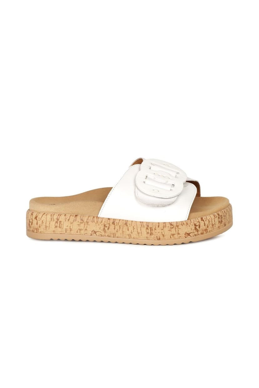 Elegant white platform mules by Gabor featuring decorative buckles and a stylish design. Perfect for adding a touch of sophistication to any summer outfit.