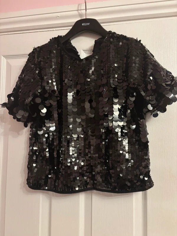 A black sequin top with flutter sleeves and a round neckline. This top is perfect for a festive and elegant look.