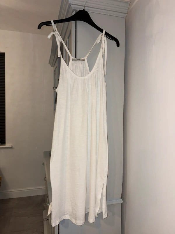 This bright white summer dress by George can be styled in multiple ways. It features adjustable straps that can be tied tighter or looser, making it versatile for various occasions. Perfect for a beach cover-up or a short summer dress.