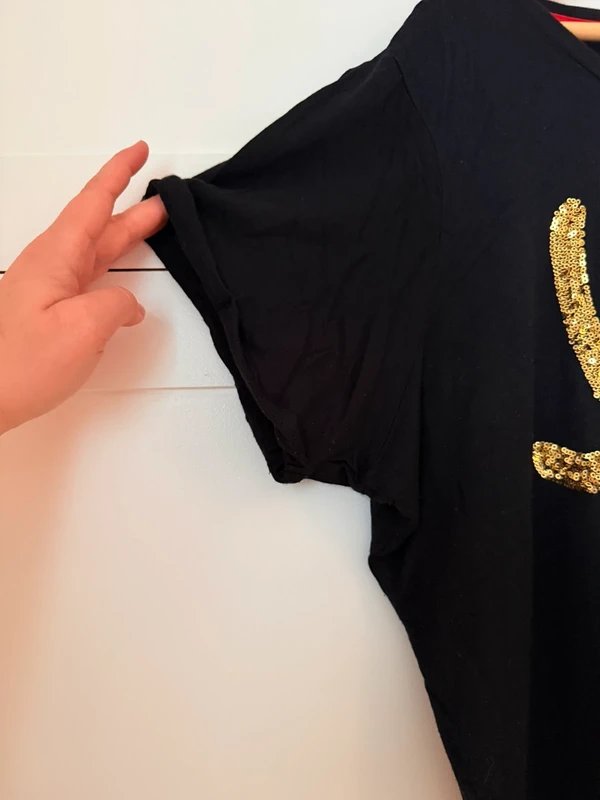 Black Christmas Reindeer Gold Sequin T-shirt Top — the perfect festive top for Christmas parties and holiday gatherings. Designed in black with gold sequin detailing, this thin slightly stretchy material t-shirt features a small slit detail on the sides. Crafted from lightweight fabric with sequin embellishments, it adds a touch of sparkle to your holiday outfits. Ideal for a fun and festive look.