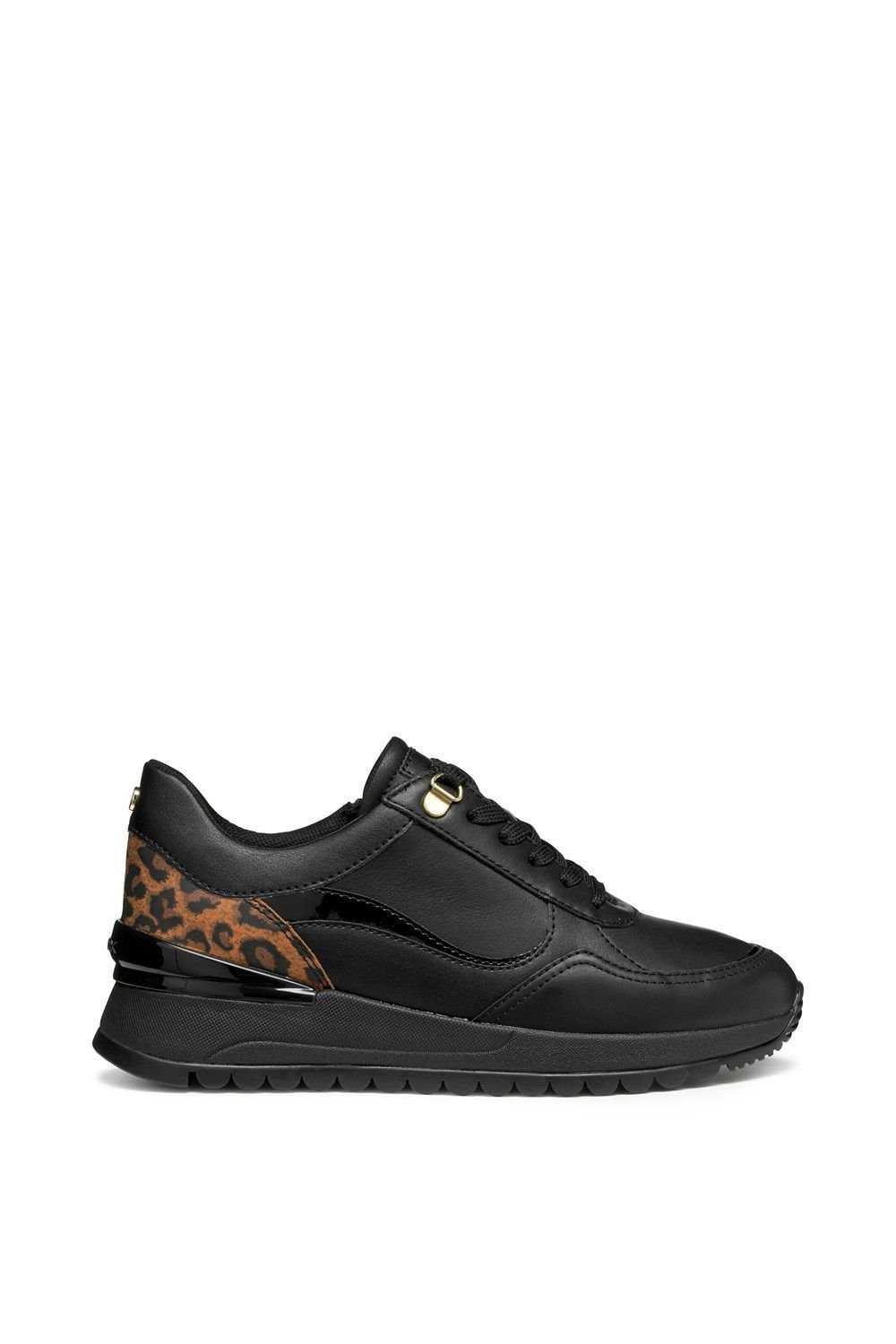 Contemporary Geox Desya A sneakers in black with a leopard print accent. Crafted from nappa leather with a patent-effect finish, these shoes offer exclusive patent 360-degree breathability and a resistant outsole. Perfect for elevating everyday city outfits.
