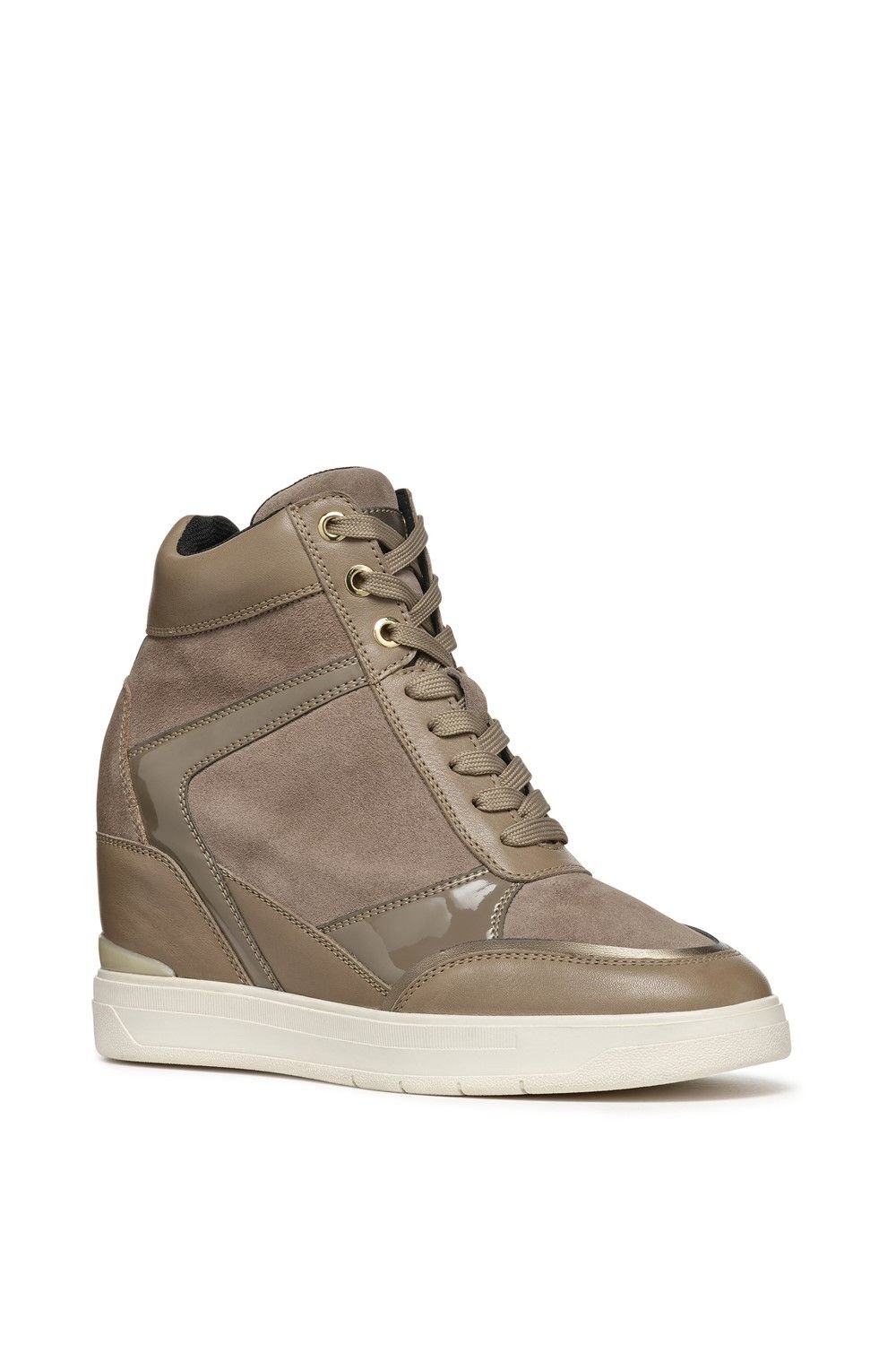 Modern Geox trainers in taupe suede with a built-in wedge for comfort. Features a lace-up design and patent 360 Degree breathability for well-being. Perfect for urban-casual wear.