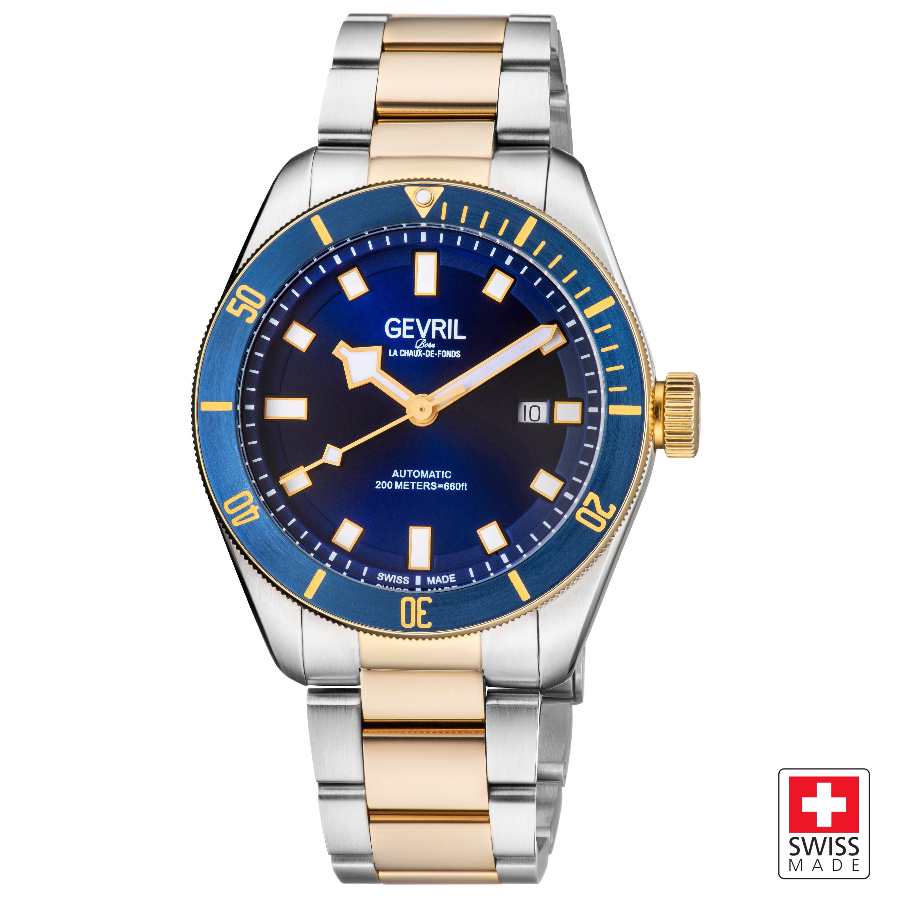 Elegant Gevril Yorkville watch with a blue dial and gold-tone stainless steel bracelet. Features a Swiss automatic movement and 200 meters water resistance. Ideal for formal and casual occasions.