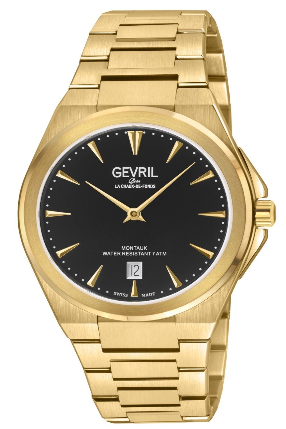 Stylish Gevril Montauk watch with a gold stainless steel case and black dial. Features a water-resistant 7 ATM rating, ensuring durability and reliability.