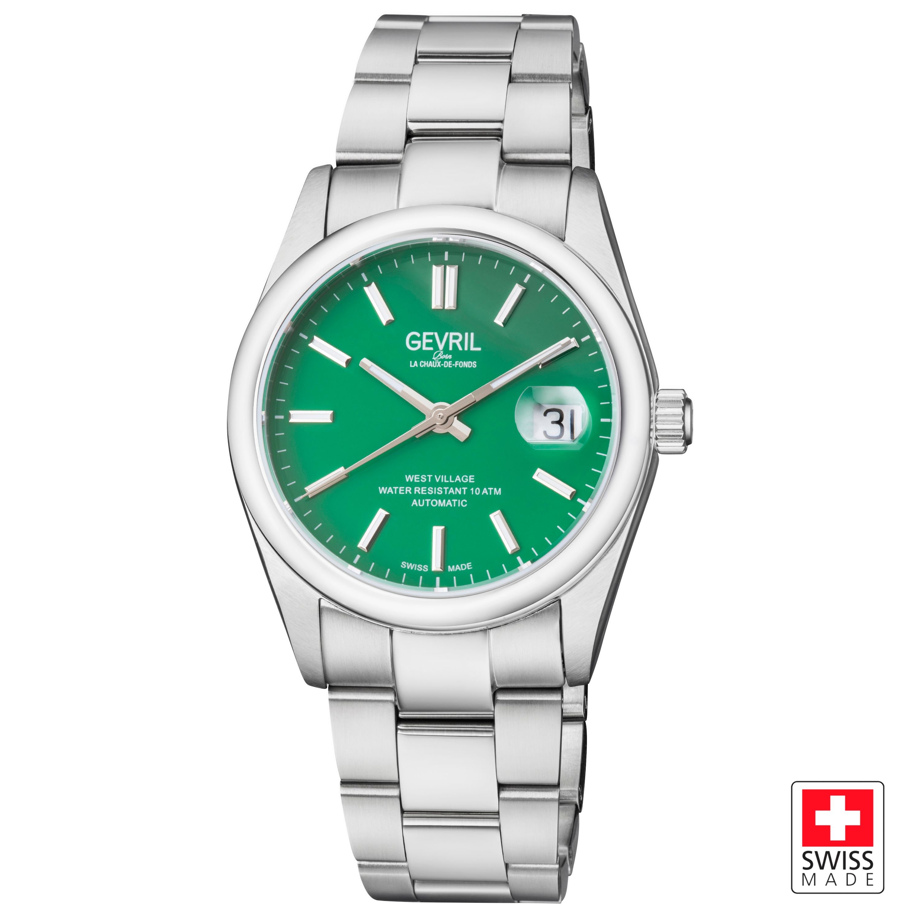 Stylish Gevril West Village watch with a dark green dial and silver-tone hands. Features a stainless steel case and bracelet, water-resistant up to 10 ATM, and a date window. Perfect for both casual and formal occasions.