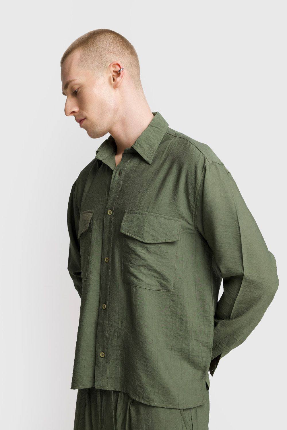 Elegant khaki polyester long sleeve shirt with a classic collar and button closure. Designed for comfort and style, it features two chest pockets and a regular fit. Ideal for casual and smart-casual occasions.