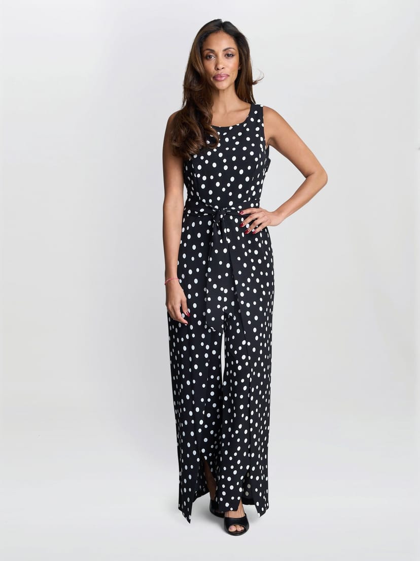 The Gina Bacconi Black Polka Dot Jumpsuit is ideal for daytime, casual, outings.