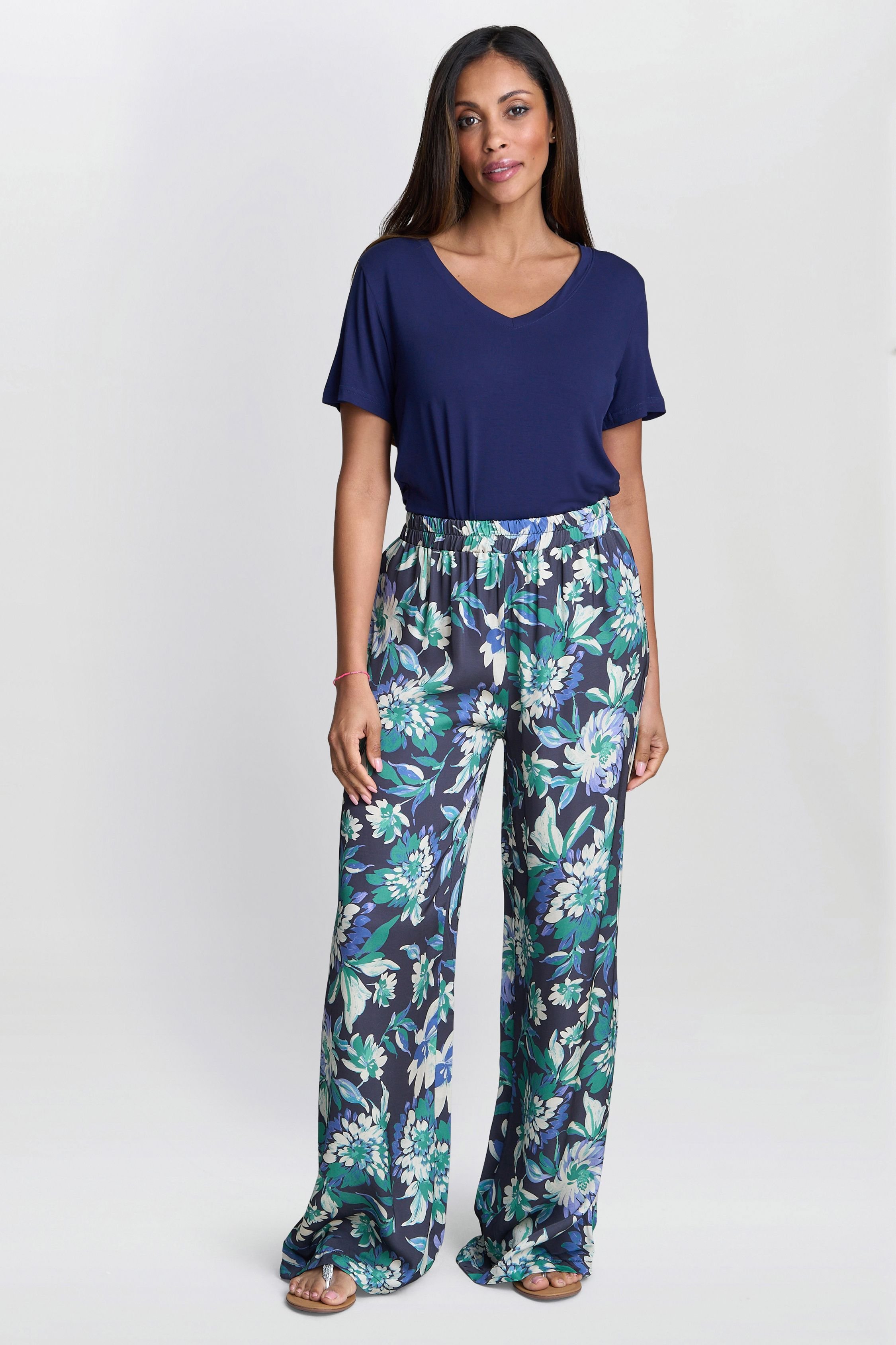 Elevate your everyday style with these blue floral satin wide leg trousers. Featuring a floral print in shades of green, white, and navy, these trousers offer a relaxed yet sophisticated fit. The elasticated waistband ensures comfort, making them perfect for both daytime and evening wear.