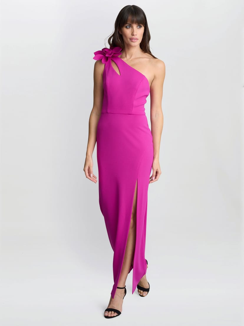 The Gina Bacconi Fuchsia One Shoulder Flower Maxi Dress is available in sizes 14.