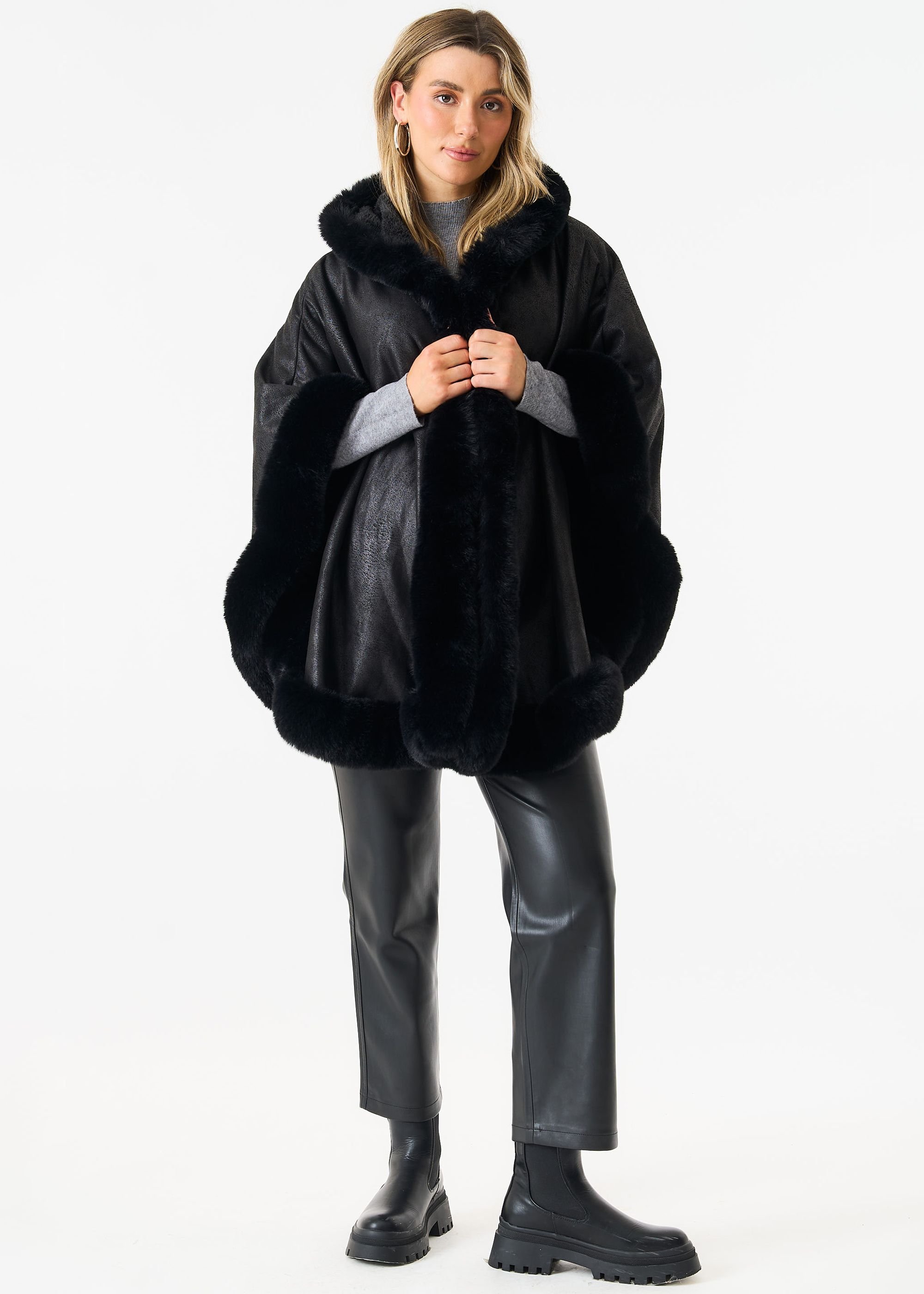 Luxurious black faux fur trim adds elegance to this poncho cape. Perfect for winter, it features a fur-lined hood and soft faux fur detailing throughout.