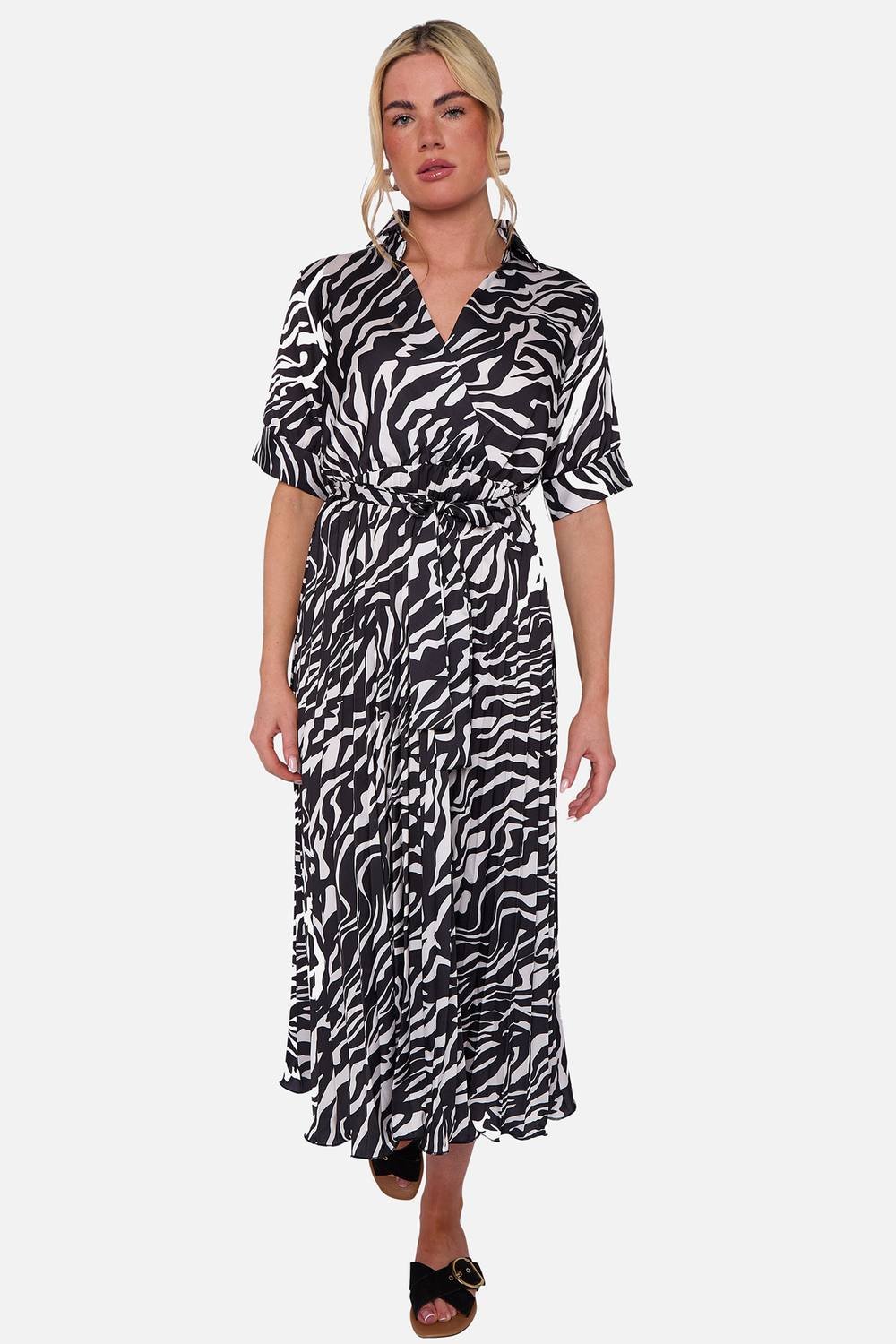 The Gini London Black Zebra Pleated Midi Dress is ideal for evening, date-night, party.