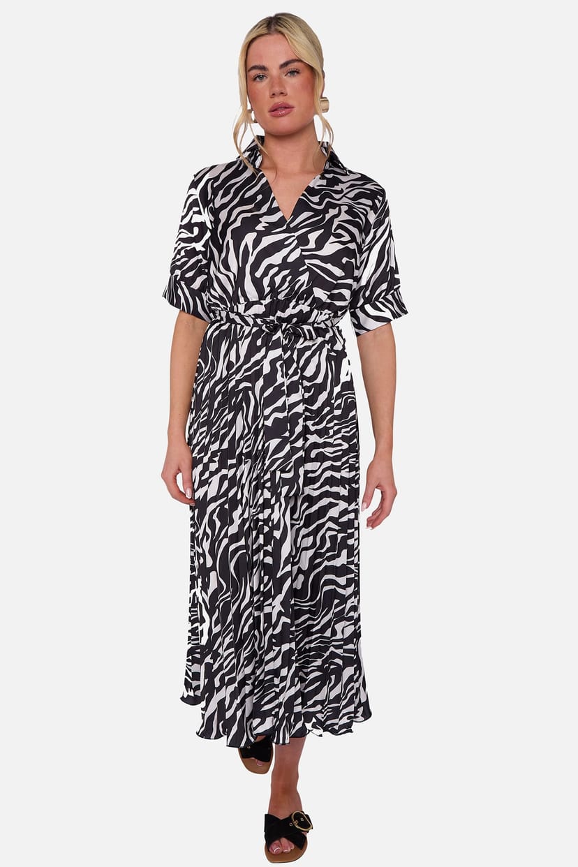 The Gini London Black Zebra Pleated Midi Dress is available in sizes XL.