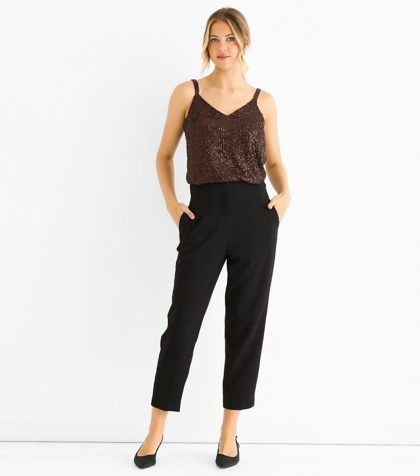 Sleek black woven cigarette trousers by Gini London. Designed for a regular fit and ankle-grazer length, these trousers feature a straight leg style and side slip pockets. Ideal for both smart styling and everyday wear.