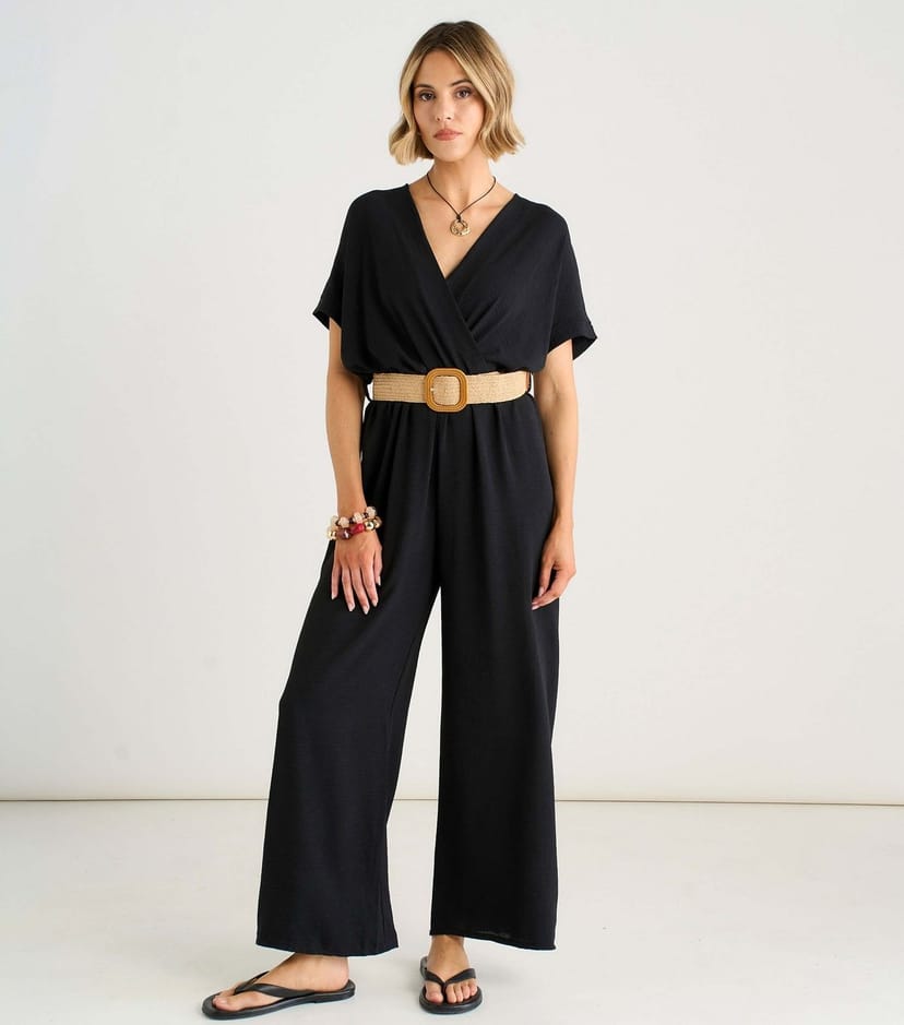 This black casual jumpsuit from Gini London is an easy one-piece style for work and weekends. It has a flattering wrap front and an adjustable belt for the perfect fit.