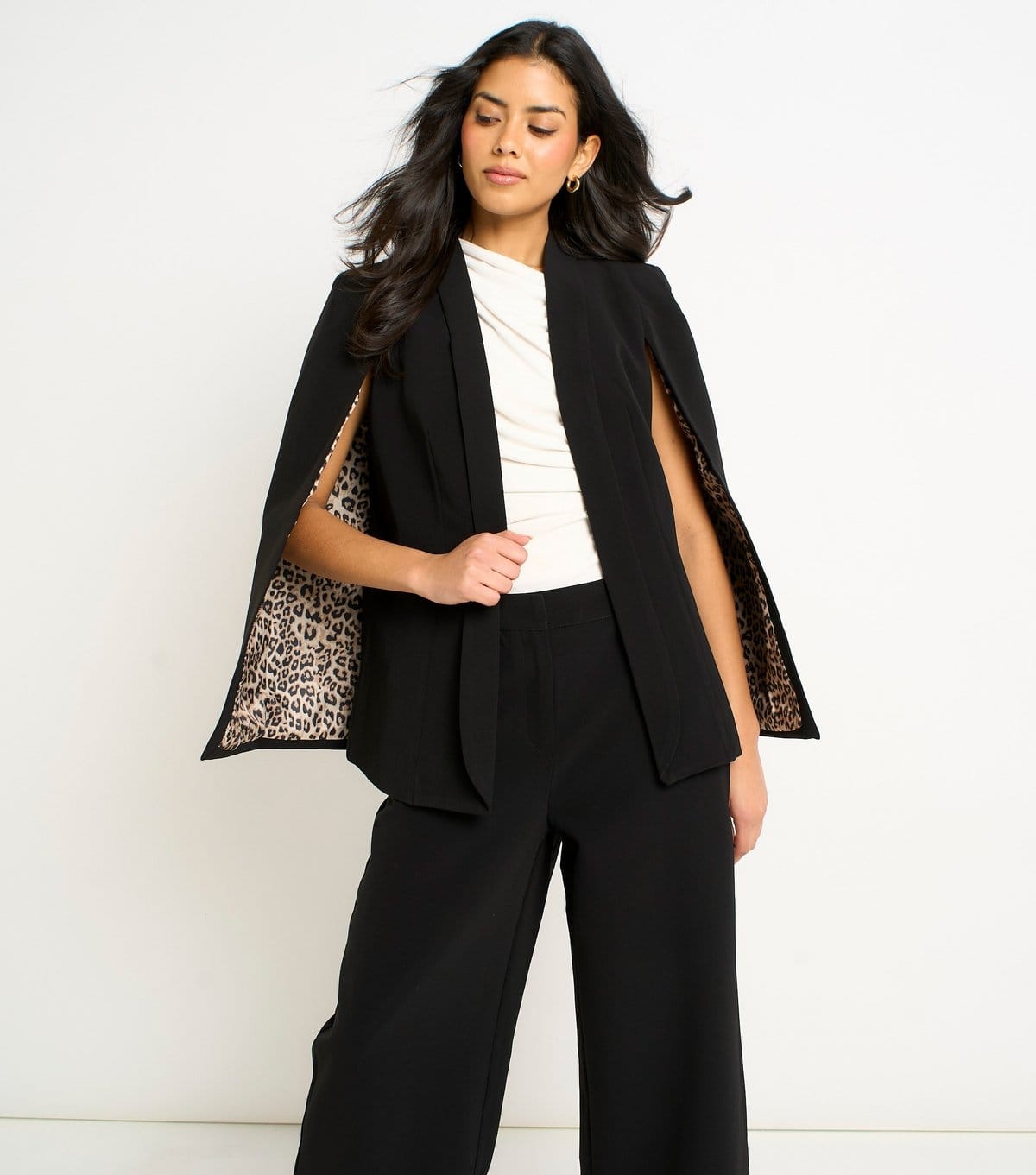 Gini London's elegant black cape blazer will lend a sophisticated yet chic twist to any outfit. The animal print lining peeks through the slit sleeves for a hint of fierceness as you walk.