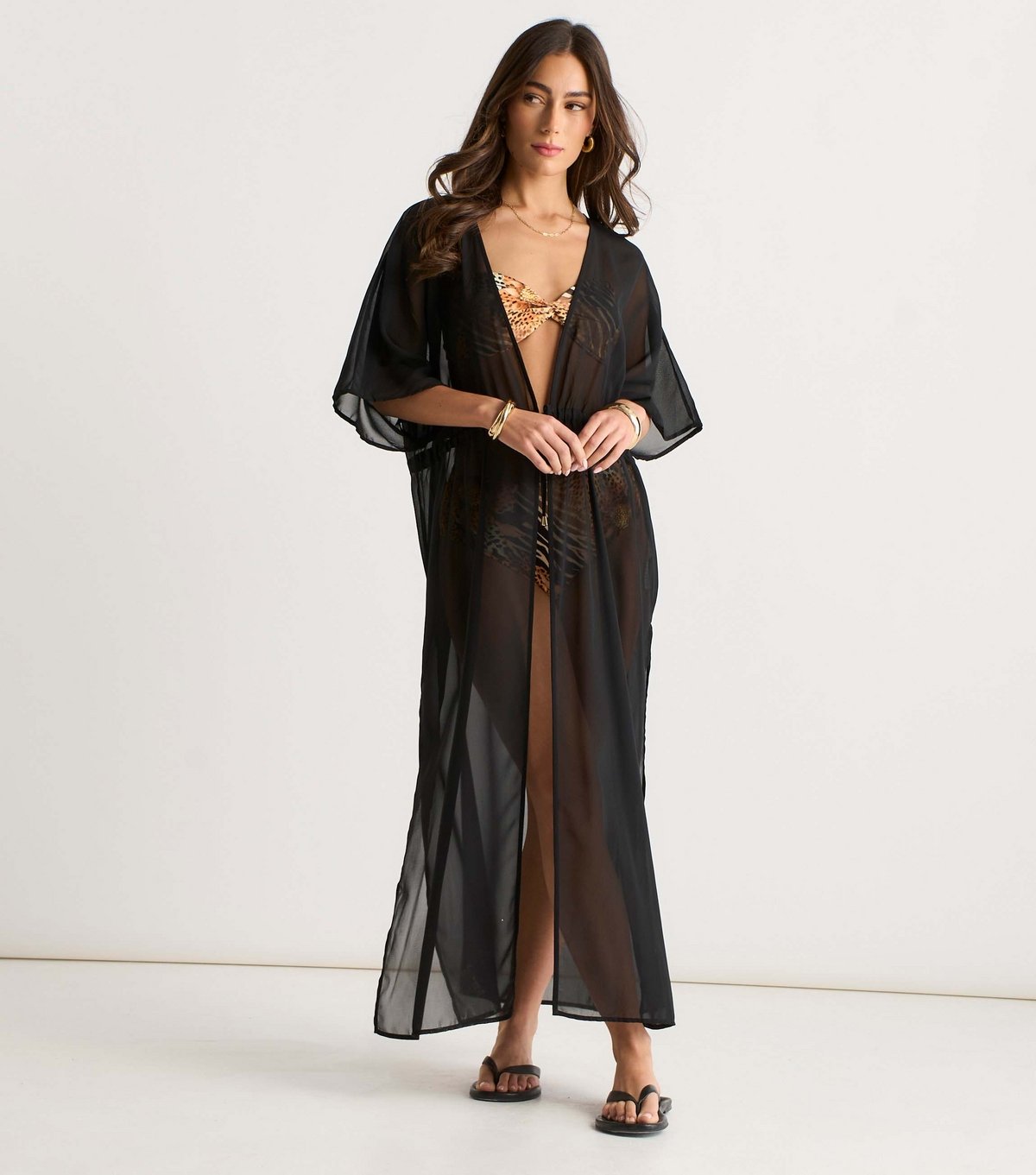 This elegant black flowy kimono from Gini London is your ultimate beach companion. Its lightweight semi-sheer design and open front give it a relaxed feel. Perfect for casual beach outings or lounging.
