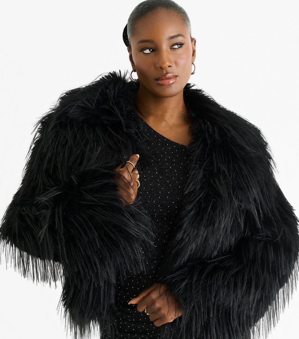 Elegant black fringed faux-fur jacket by Gini London. Soft and cosy, it's perfect for layering over elegant outfits for cocktail parties or special dinners.