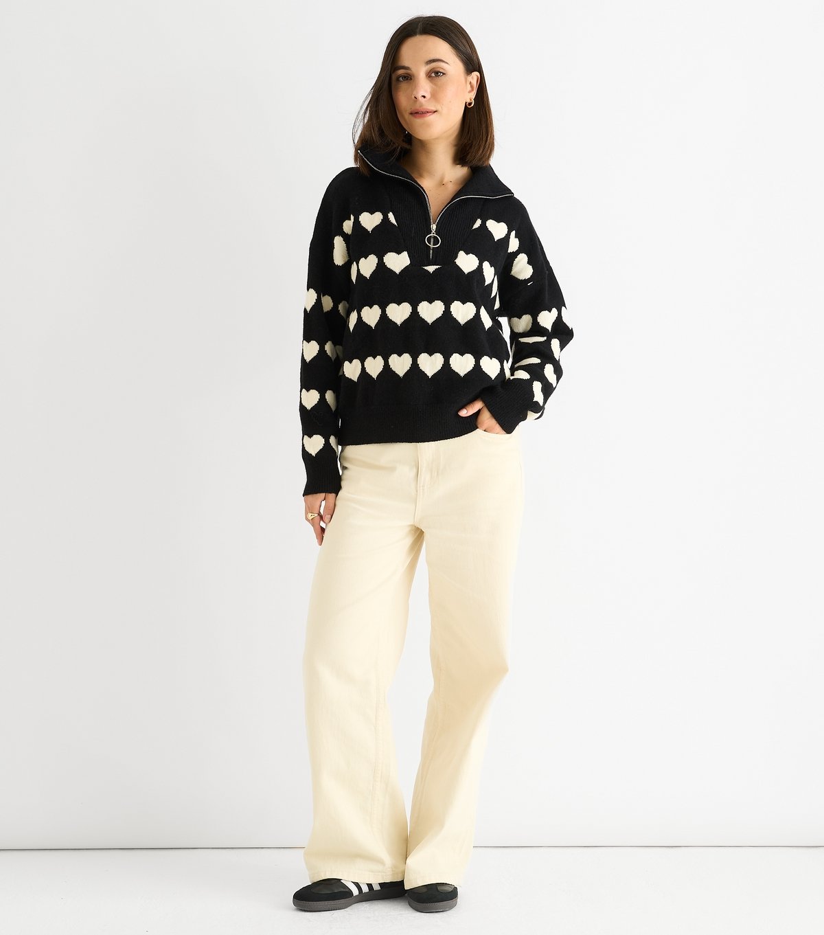 Trendy knitted jumper in black and white heart pattern. Features a full-length zipper and a relaxed loose fit. Ideal for casual days out.