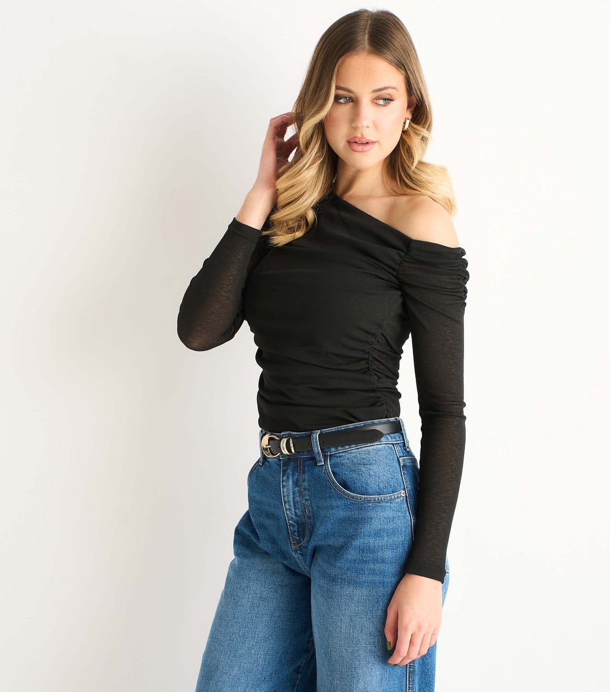 Stylish black jersey off-shoulder top by Gini London. Features a slim fit, long sleeves, and ruching for a flattering silhouette. Perfect for casual or evening wear.