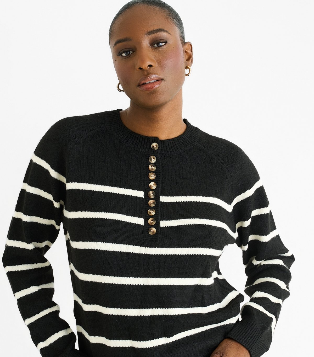 The Gini London Black & White Striped Henley Jumper is available in sizes L/XL, M/L, S/M.