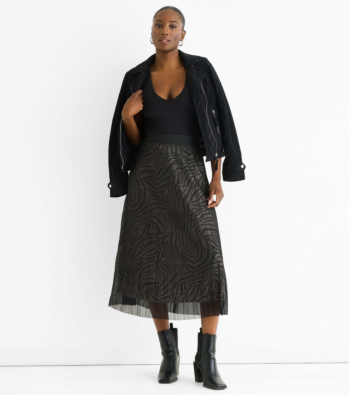 Striking black zebra print midi skirt with a mesh overlay and pleated design. Features an elasticated waist and A-line silhouette. Perfect for transitioning from day to night.