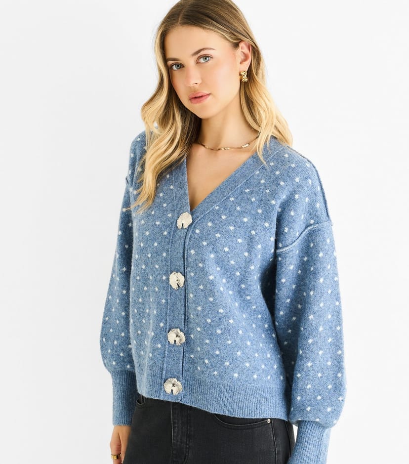The Gini London Blue Polka Dot Knit Cardigan is made from knit.