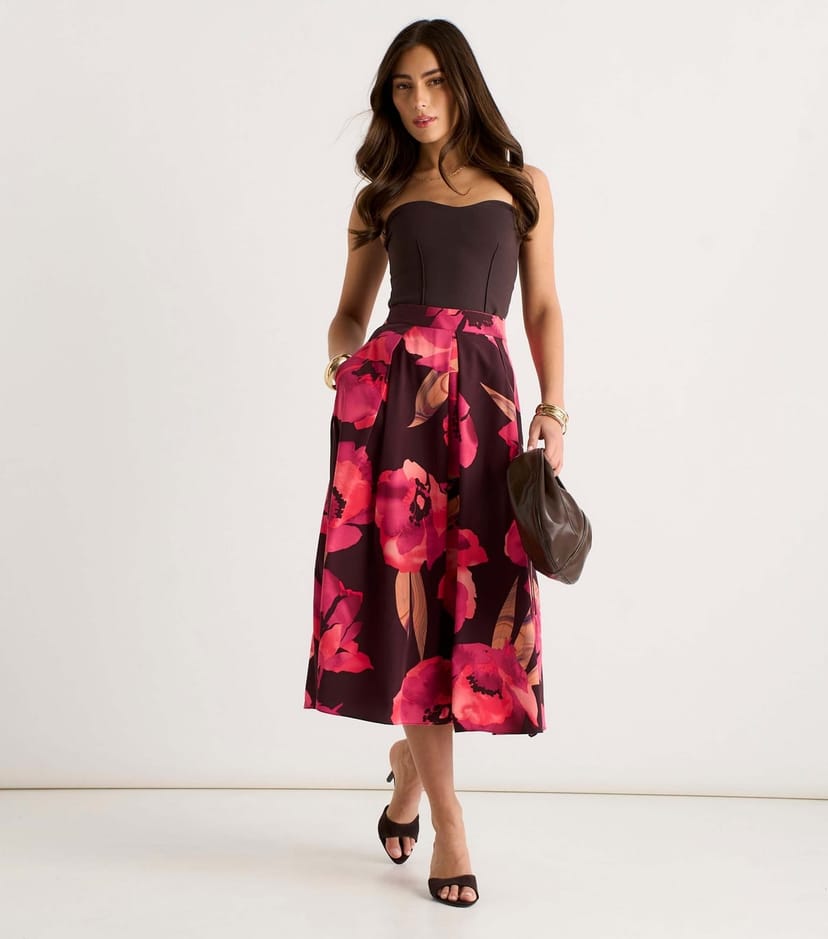The Gini London Brown Floral Pleated Midi Skirt is available in sizes 10, 12, 14, 16, 8.