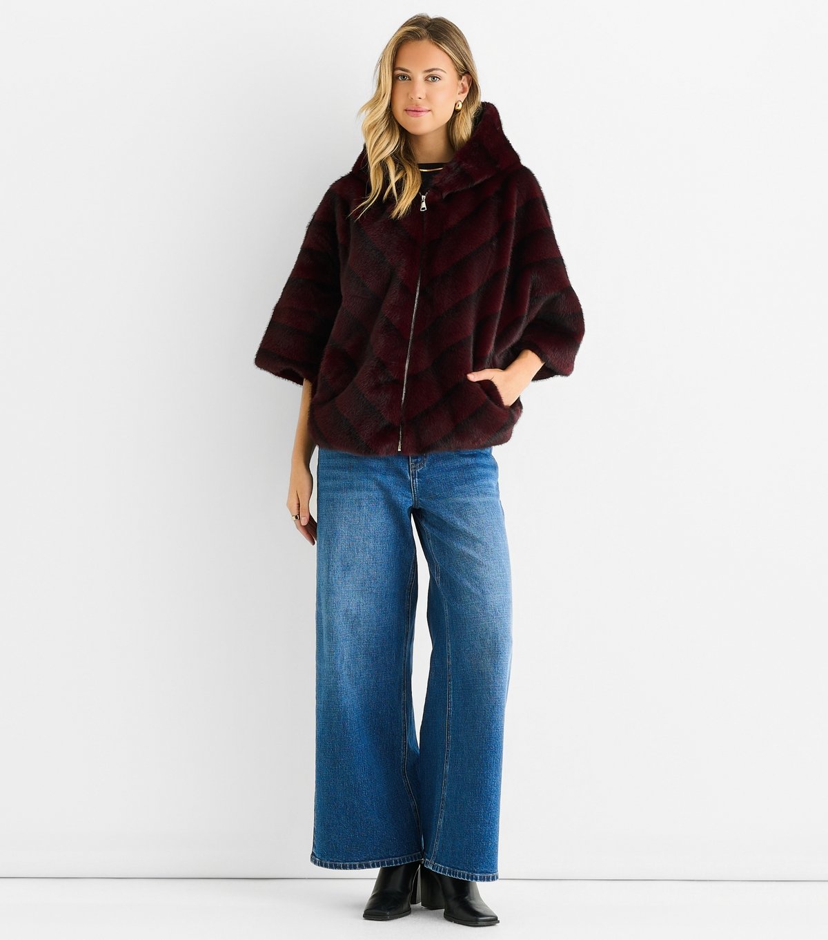 Stylish burgundy faux fur jacket from Gini London. Featuring a slouchy hood and chevron design, this jacket is perfect for the transitional period. Made from soft faux fur, it offers warmth and style.