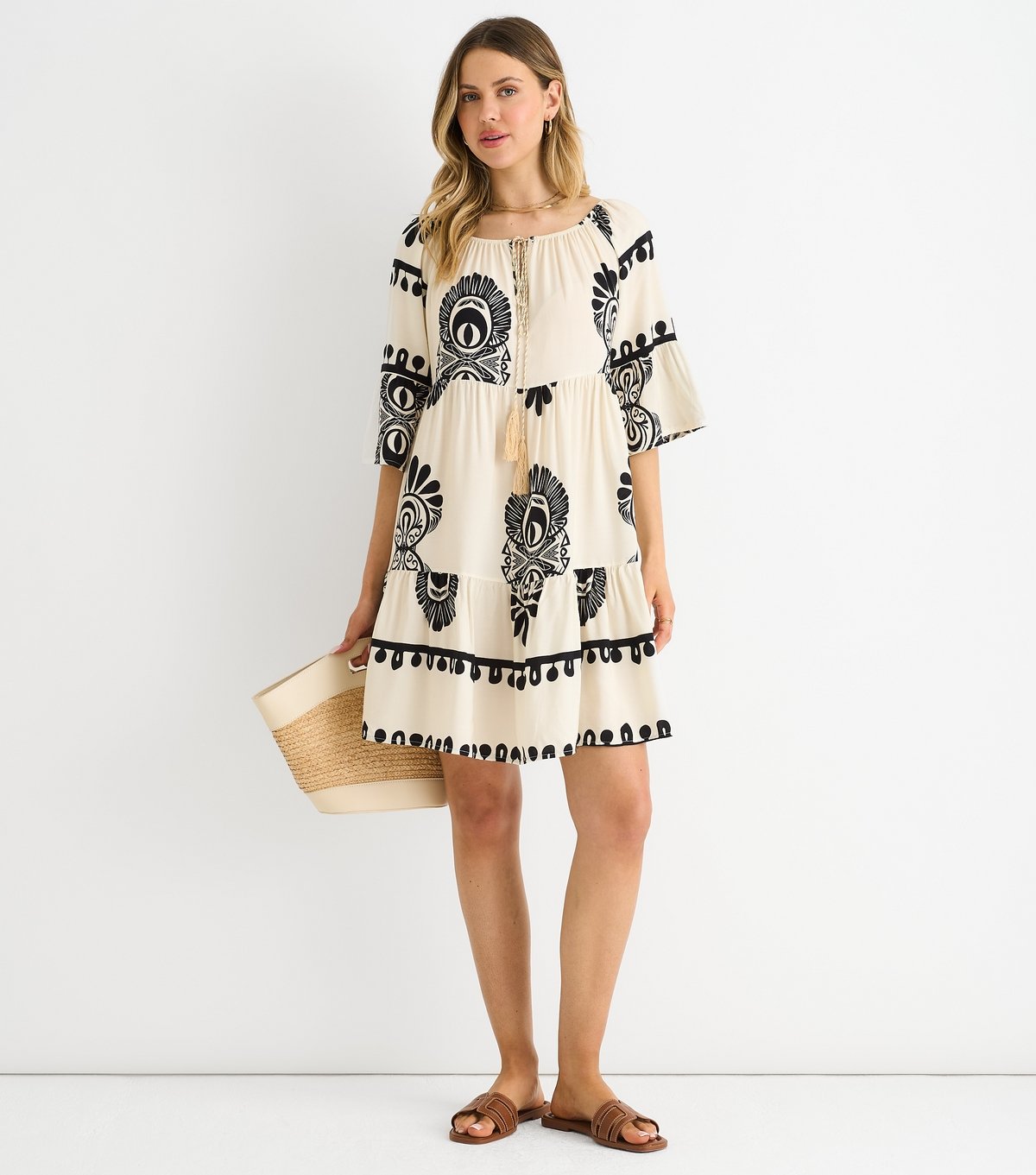 This cream mini dress from Gini London offers effortless style with a bold pattern print. Its woven fabric ensures comfort all day long, whilst the elasticated neckline allows it to be worn multiple ways. Perfect for casual outings or summer events.