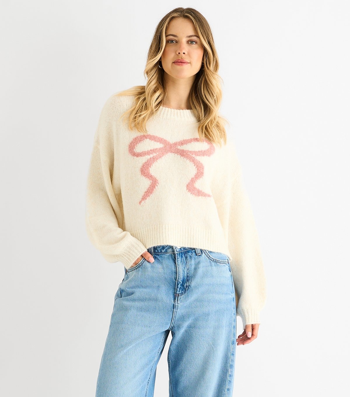 Playful cream jumper with a relaxed fit and a charming pink bow design. Features ribbed trims at the neckline, cuffs, and hem for a stylish contrast. Perfect for casual wear.