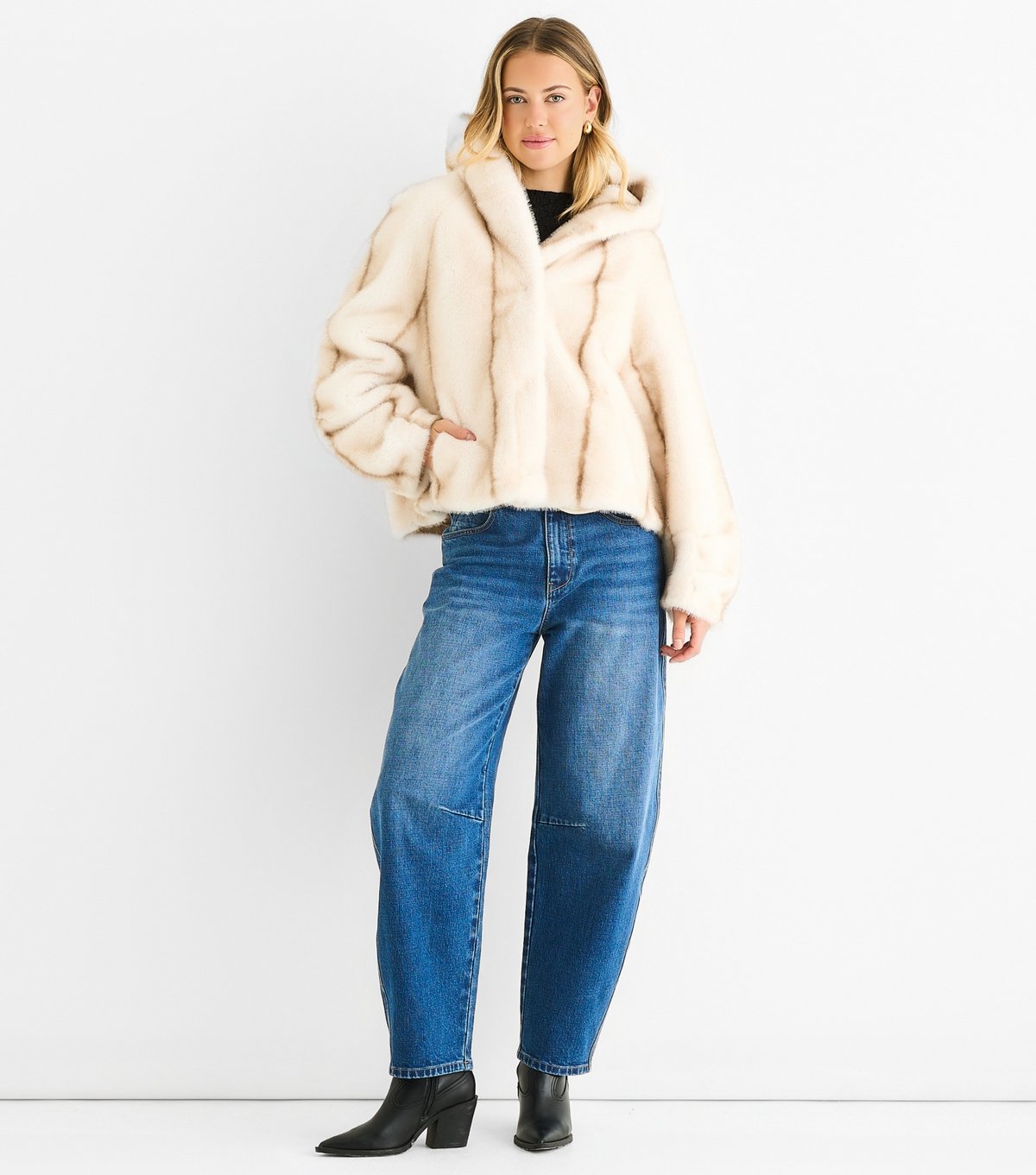 The Gini London Cream Ombre Hooded Faux Fur Jacket is available in sizes L/XL, M/L, S/M.