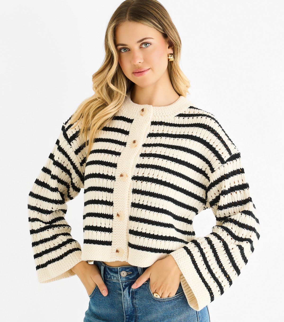 The Gini London Cream Striped Textured Cardigan is available in sizes L/XL, M/L.