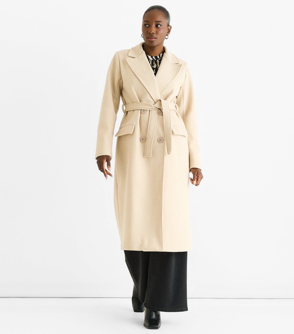 Elegant oatmeal double-breasted coat from Gini London. The collared neckline and longline length make it perfect for office wear. Crafted from woven fabric for a polished look.