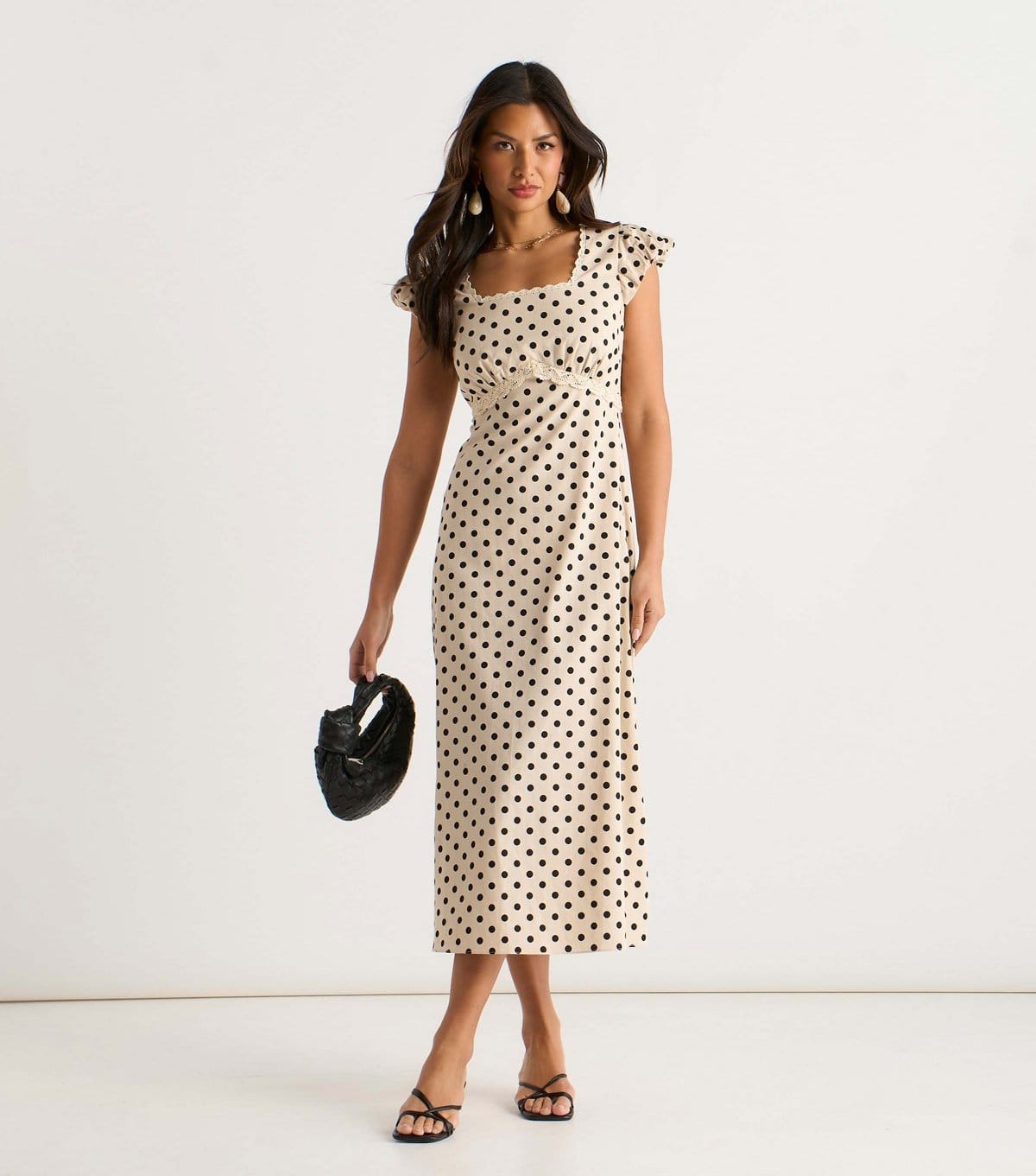 View New Look UK's returns policyInstantly eye-catching thanks to its bold polka dot print, this midi dress from Gini London is a stylish addition to summer wardrobes. An easy piece to dress up or down, it benefits from gathered puff cap sleeves and a tonal lace trim.