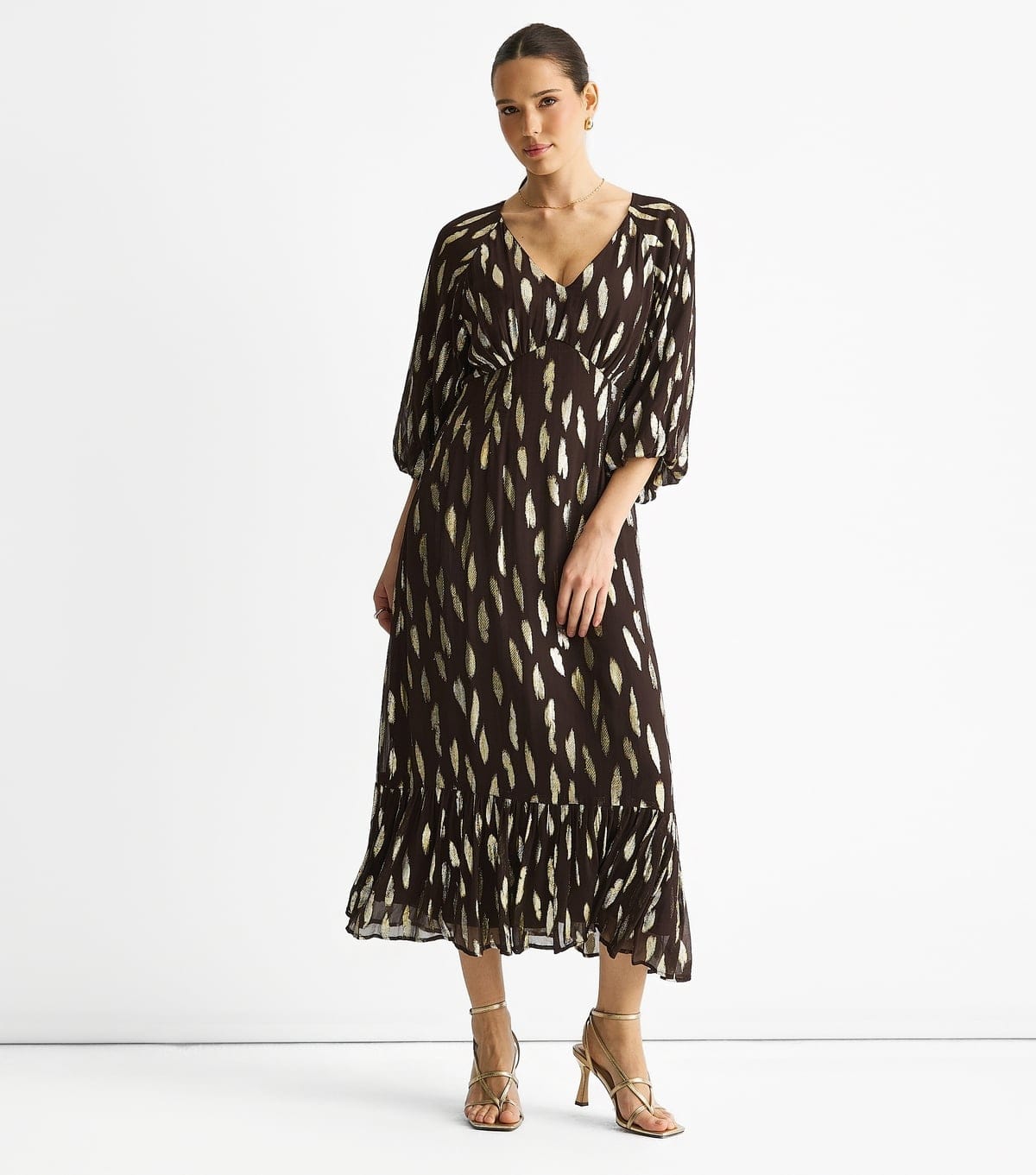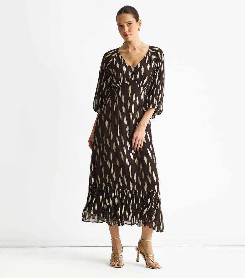This stunning black midi dress from Gini London features a metallic abstract pattern and charming bubble sleeves. The flowy fit and gathered hem create a flattering silhouette, perfect for both special events and holiday wear.