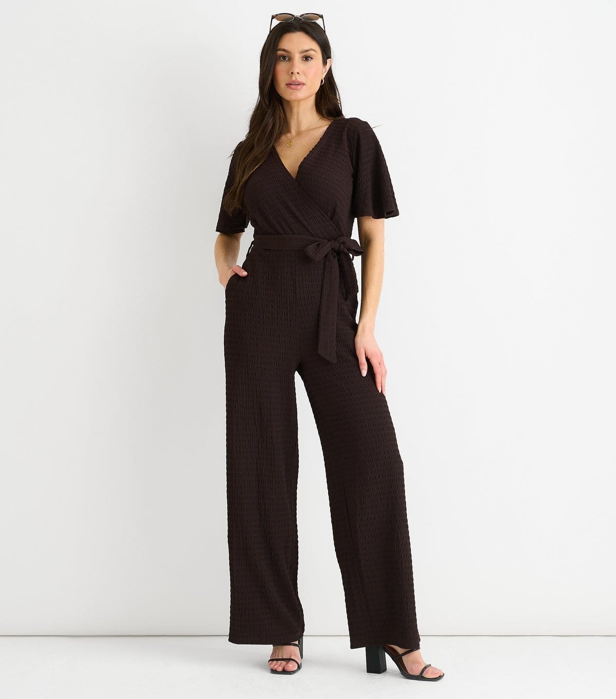 The Gini London Dark Brown Textured Wrap Jumpsuit is ideal for casual, evening, date-night.