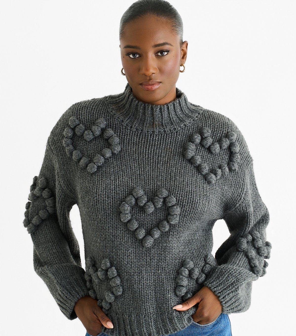 This grey chunky knit jumper by Gini London offers non-stop comfort and warmth. The bubble heart details add a dimensional twist. Ideal for casual wear.