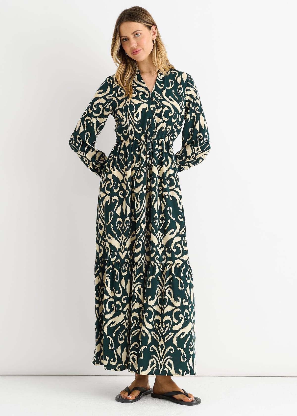 Elegant maxi dress in green ikat print with a flattering tie waist. Perfect for any occasion, dress it up or down for endless styling possibilities.