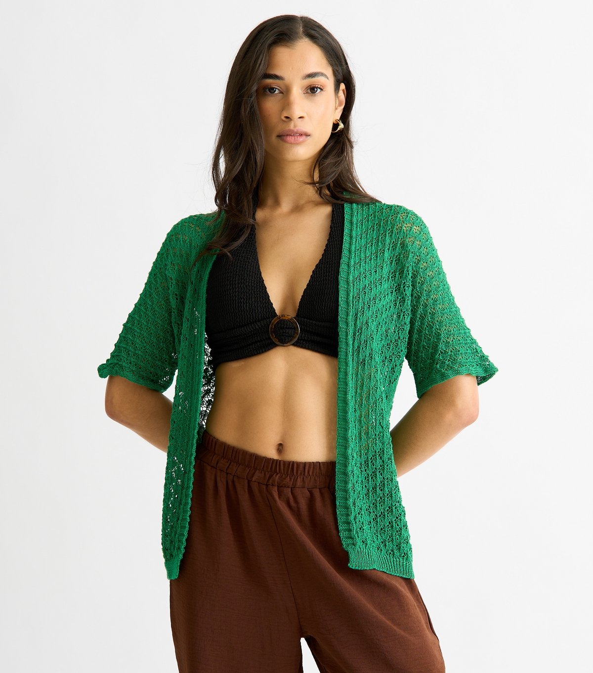 This green crochet cardigan by Gini London adds a vibrant touch to your summer wardrobe. Its relaxed fit makes it perfect for casual layering. Ideal for low-key outings.