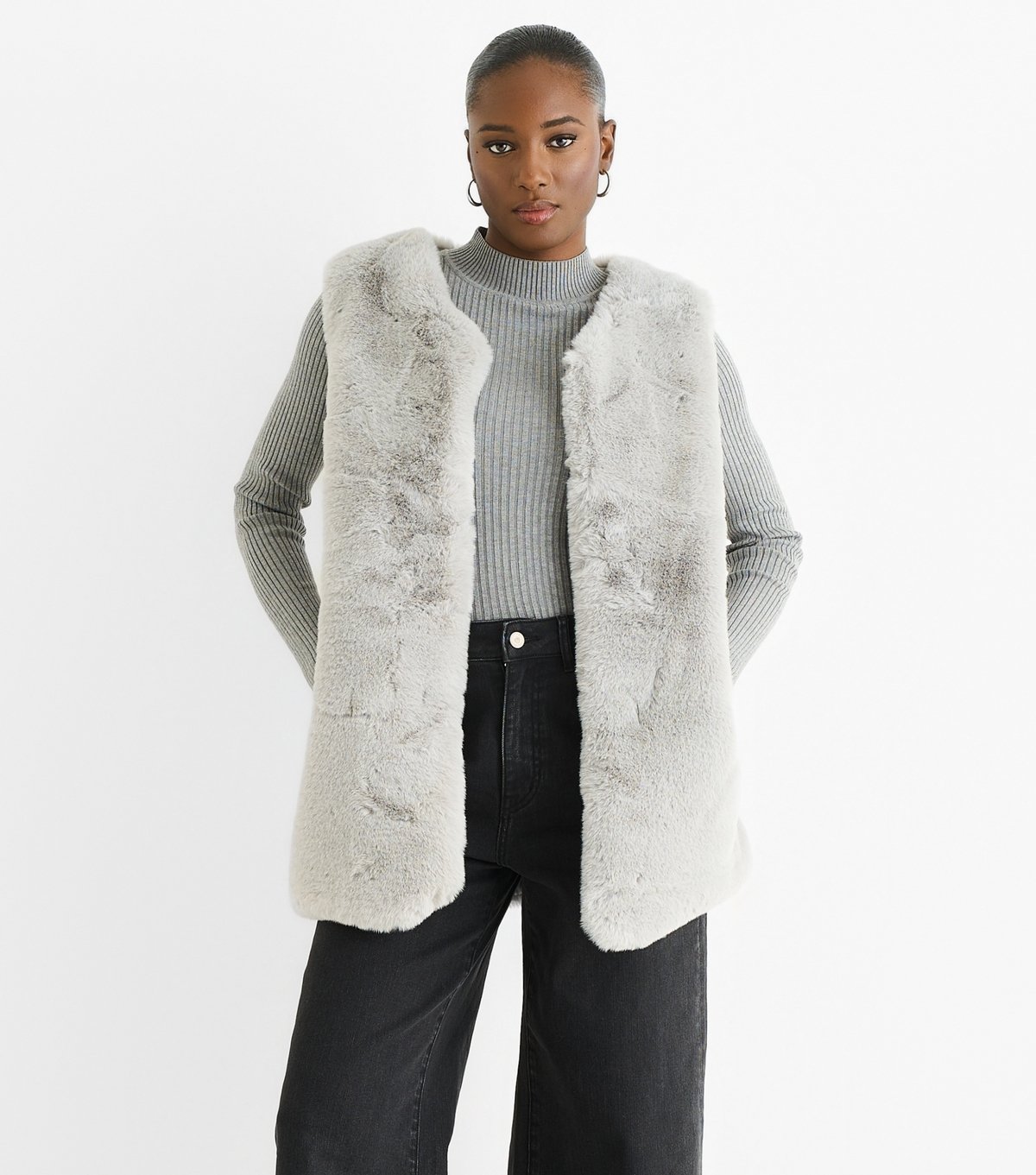 Cozy grey faux fur gilet from Gini London. Perfect for autumn, this sleeveless piece features an open front and a regular fit. Ideal for layering over your favorite outfits.