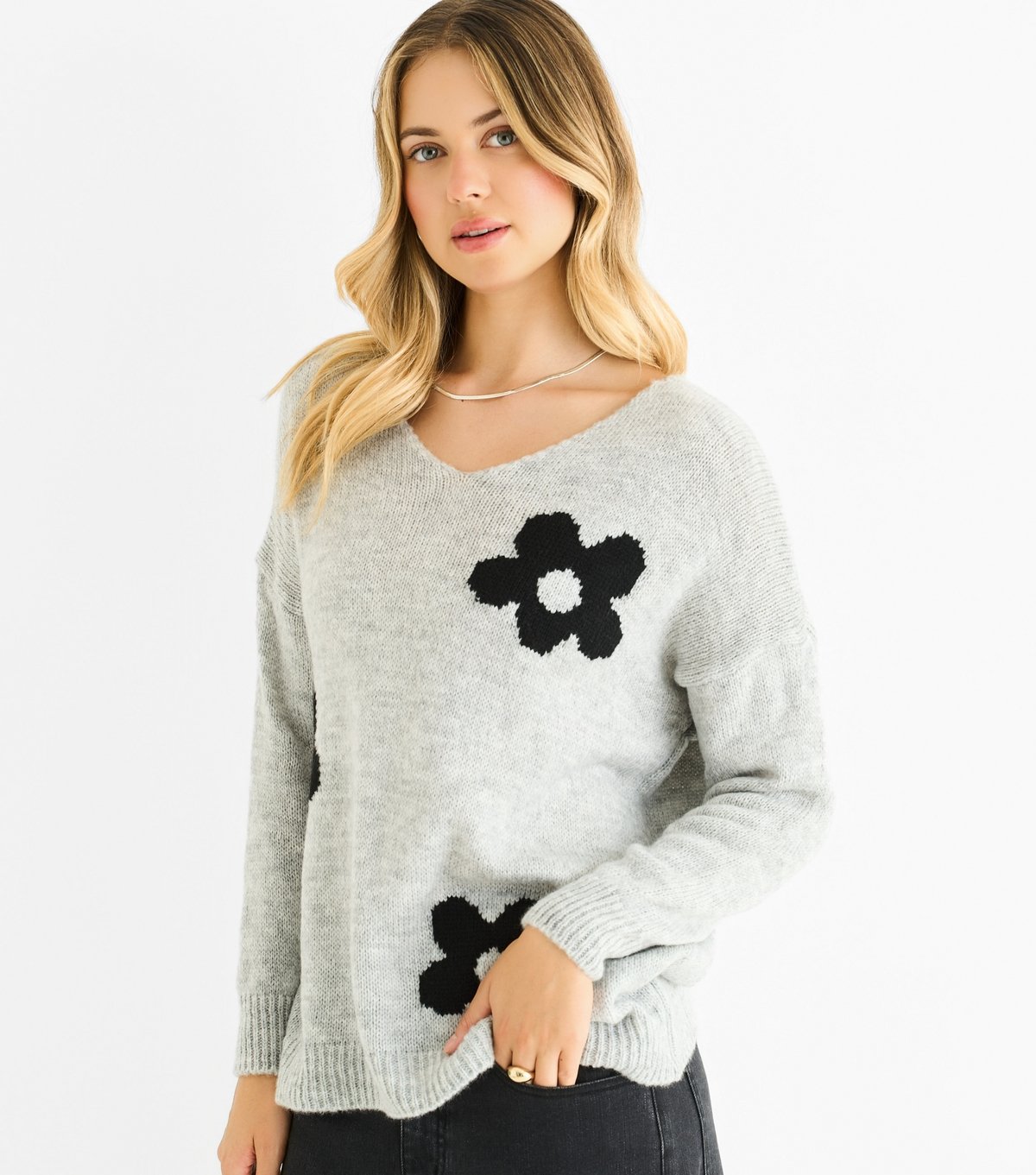 Chic grey floral jumper from Gini London. Features a relaxed V-neckline, long sleeves, and dropped shoulders. Perfect for a light layer.